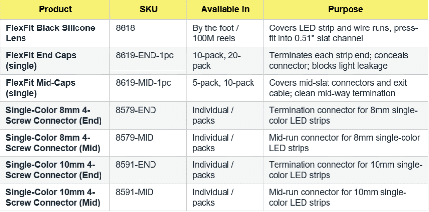 - End Caps (SKU 8619-END): covers strip ends and connectors; blocks light leakage; creates clean terminations