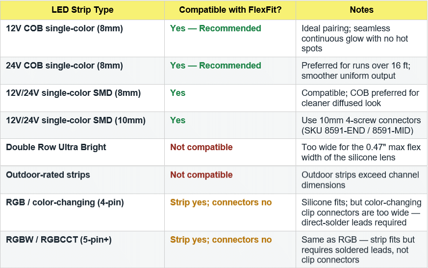 While the FlexFit silicone lens works with all standard single-color Inspired LED strips in 8mm and 10mm widths, the pairing we recommend, and the one that produces the most breathtaking result, is our 12V or 24V COB (chip-on-board) single-color LED strips.