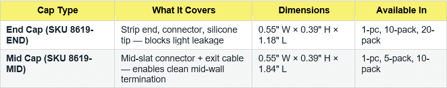 - Mid-Caps (SKU 8619-MID): covers mid-slat connectors and exit cables; allows strips to terminate mid-wall without visible hardware