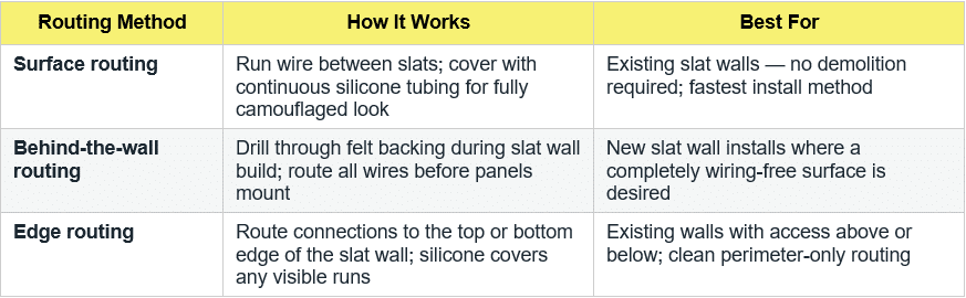 - Choose your wire routing method. Surface routing (between slats, covered by continuous silicone), behind-the-wall routing (new builds only, wires through felt backing), or edge routing (wires exit at top or bottom of wall).