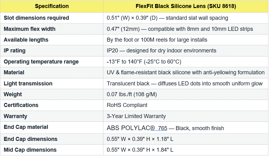 - Black Silicoone Lens (SKU 8618): press-fits into 0.51″ slat channels; diffuses LED into smooth glow; completely concealed when off