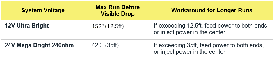 Just know, voltage drop is subjective! Some find it more noticeable than others. You are always welcome to push these max runs as needed. People tend to notice voltage drop once the light output dips under 70%. An example with out Ultra Bright is illustrated below: