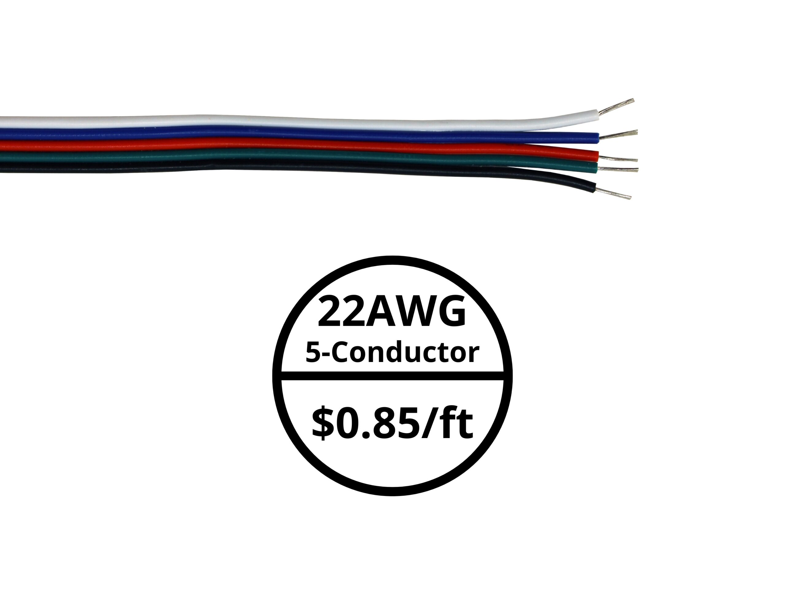 22AWG 5-Conductor Ribbon, stranded cable. Ideal for soldering to Inspired LEDs 24V RGBW LED strips or to interconnect with wire nut connections.